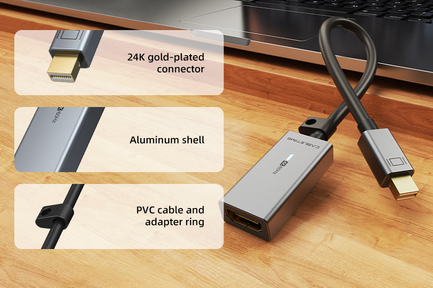The 4K Mini DisplayPort to HDMI adapter comes with a corrosion-resistant 24k gold-plated connector for added connectivity, an aluminum housing and PVC cable to ensure long life