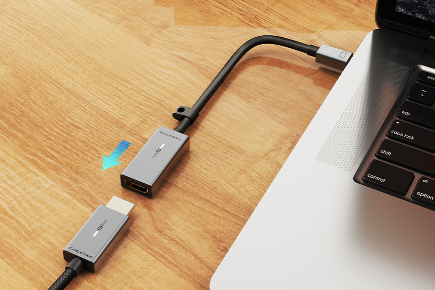 This Mini Display Port to HDMI adapter connects a laptop or tablet with Mini DP, Thunderbolt 1 or 2 directly to a UHD TV, 4k display or projector